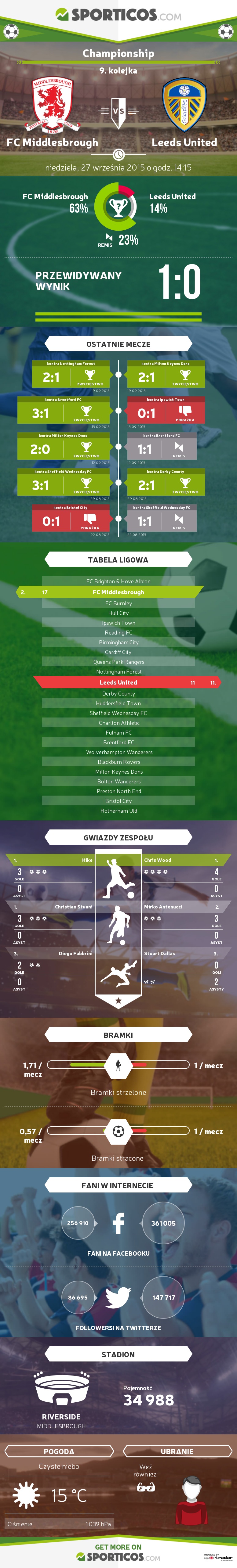 Na przestrzeni ostatnich 15 lat (a nawet więcej) chyba nie było w Anglii równie gościnnego stadionu dla piłkarzy Leeds jak Riverside Stadium. Dość powiedzieć, że Boro wygrało zaledwie 1 na ostatnich 11 spotkań rozgrywanych na swoim stadionie z Leeds. Sztuka ta udała się gospodarzom w 2013 roku kiedy po golu Curtisa Maina wygrali 1:0. Od tamtego meczu jednak gospodarze znów notują serię bez zwycięstwa nad Leeds. Ostatni mecz obu zespołów na Riverside miał miejsce w lutym tego roku, a niekwestionowanym jego bohaterem był Marco Silvestri, który wybronił aż 10 strzałów piłkarzy Karanki i zachował czyste konto, a jako, że już w 3 minucie jedyną bramkę spotkania zdobył Alex Mowatt to pawie przywiozły 3 punkty z Middlesbrough. Warto wspomnieć, że sam Aitor Karanka podczas przedmeczowej konferencji stwierdził, że dotychczas nie wygrał z Leeds (3 porażki i 1 remis), więc chęć zwycięstwa jest dla niego tym większa.
