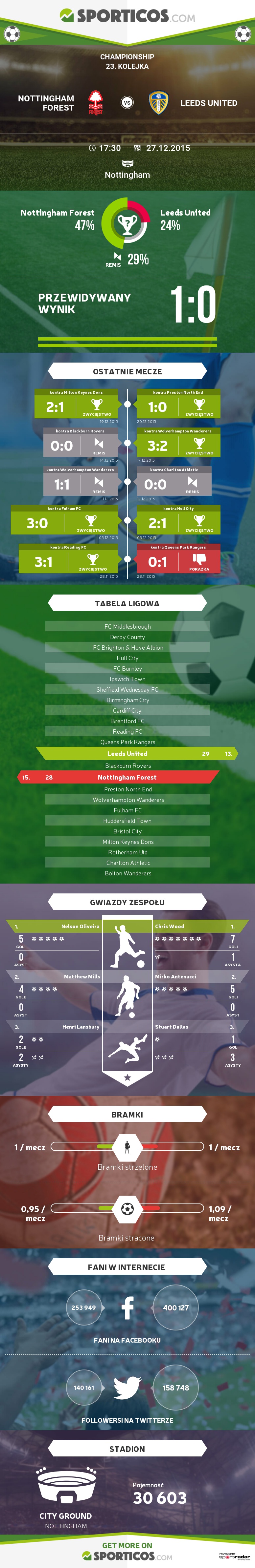Uparli się twórcy terminarza Championship żeby upchnąć mecz wyjadowy z Forest gdzieś w okolicach Świąt Bożego Narodzenia. Cóż tak pewnie musi być. A teraz do sedna. To nie będzie łatwy mecz, to będzie mecz piekielnie trudny i pewnie mocno wyrównany. Obydwa zespoły prezentują ostatnio naprawdę dobrą formę i o zwycięstwie mogą przesądzić detale. Takim detalem mogłaby być liczba dni odpoczynku, które przed meczem miały obydwie drużyny, ale jako, że teraz przerwa pomiędzy meczami była nieco dłuższa wierzę, że piłkarze Leeds nie będą aż tak wypompowani jak w meczu z Preston i sprostają warunkom postawionym przez Forest.