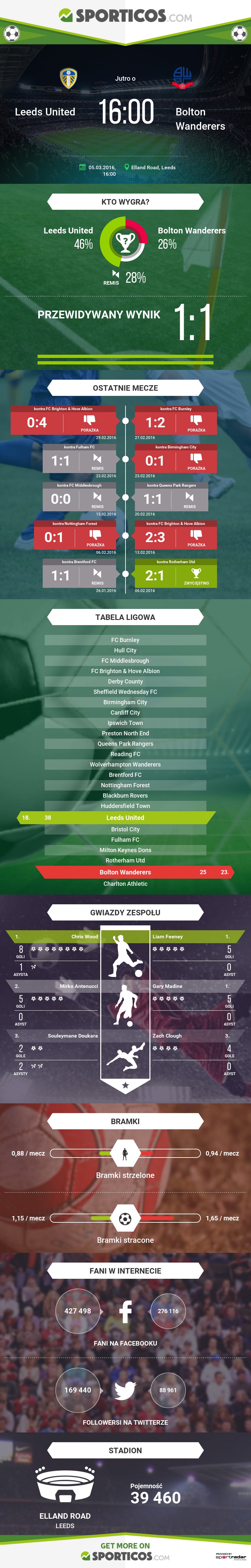 Co tu dużo mówić, Bolton piłkarzom Leeds leży. Dość stwierdzić, że na 8 ostatnich meczów pomiędzy tymi rywalami United wygrali 4 – krotnie, zremisowali 3 – krotnie i tylko raz przegrali (co prawda było to zwycięstwo aż 5:1 na Elland Road w marcu 2014 roku). Ostatni mecz na Elland Road pomiędzy tymi zespołami miał miejsce w sierpniu 2014 roku i zakończył się najskromniejszym z możliwych zwycięstwem United po bramce Stephena Warnocka. Ciekawa jest również statystyka, która mówi, że Leeds prawie zawsze (a przynajmniej od 2002 roku) zawsze strzelają bramkę w meczu z Boltonem.