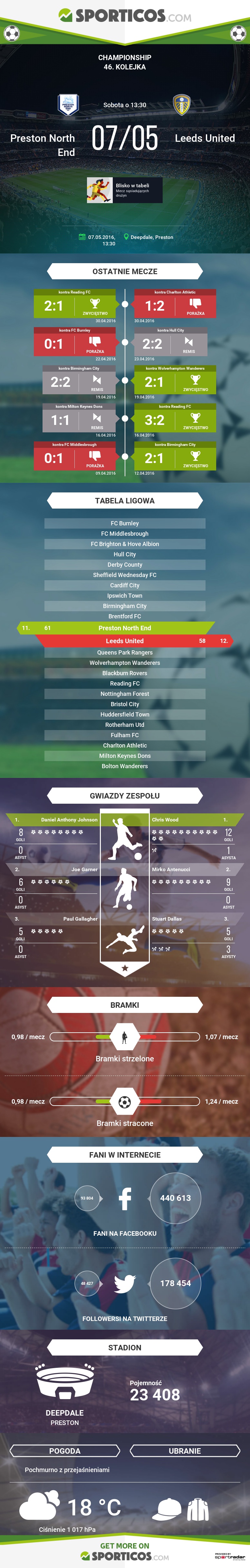 No i doczekaliśmy się ostatniego meczu w sezonie. Nie takiego na jaki liczyliśmy, nie o stawkę, którą chcieliśmy żeby grało Leeds, ale fakt pozostaje faktem, że jutro o 13:30 piłkarze United po raz ostatni w tym sezonie wybiegną na boisko aby zagrać w Championship. Rywalem Pawi będzie prowadzone przez Simona Graysona Preston North End. Mecz zostanie rozegrany na stadionie Deepdale a jego stawką będzie 11 miejsce w ligowej tabeli na koniec sezonu. Na jutrzejsze spotkanie wybiera się ponad 5500 kibiców Leeds, którzy na pewno zadbają o głośny dopingować The Whites.