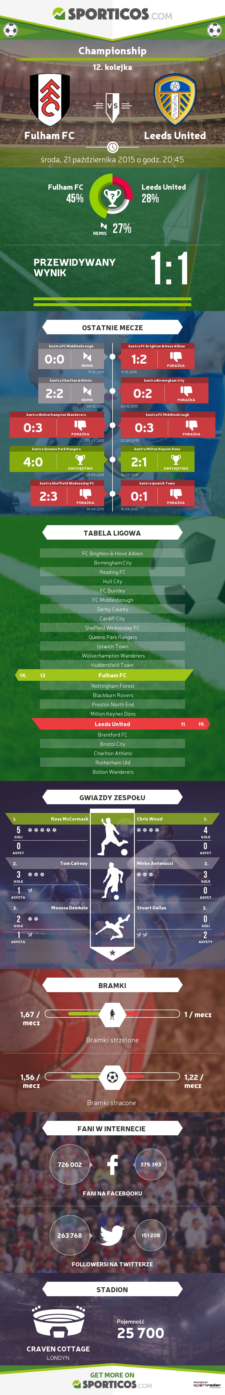 Obydwie drużyny w tabeli Championship dzieli 5 pozycji i zaledwie 2 punkty, Fulham jest 14 z dorobkiem 13 punktów, Leeds 19 z dorobkiem 11 punktów. Obydwa zespoły nie spełniają pokładanych w nich nadziei i głownie przeplatają marne występy z kilkoma niezłymi, tak jest w przypadku Leeds, które wygrało wyjazdowe mecze z Derby i MK Dons, tak jest z Fulham, które potrafiło np. wygrać wysoko z Sheffield Wed., czy QPR, ale również potrafiło także zebrać u siebie srogi łomot od Wolves. W przypadku Leeds kiepska postawa w lidze kosztowała pracę Uwe Röslera, w Fulham na razie nie mówi się o zwolnieniu Kita Simonsa, ale wiadomym jest, że drużyna z Londynu marzy o powrocie do angielskiej elity i jeśli forma Fulham nie wzrośnie również i ten menedżer może pożegnać się z pracą. Jak już wcześniej zostało wspomniane dzisiejszy mecz będzie debiutanckim dla Stevea Evansa i wyrokowanie jaki wpływ na nowych podopiecznych mógł wywrzeć Szkot jest jak wróżenie z fusów.