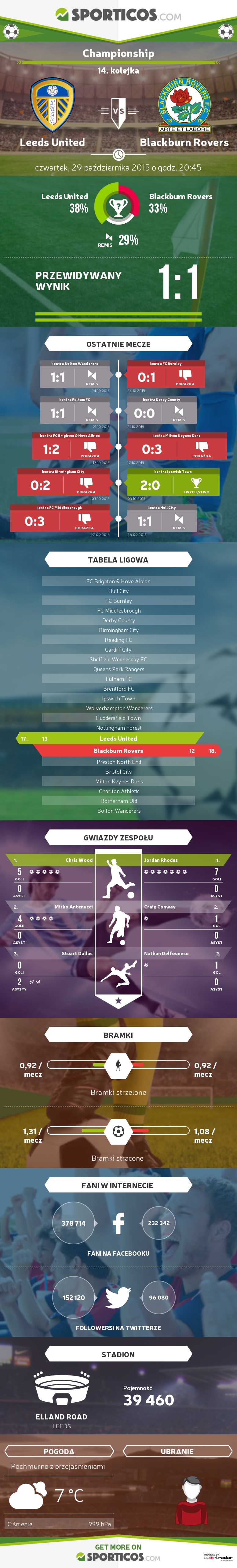 Obydwa zespoły sąsiadują ze sobą w ligowej tabeli. Leeds jest 18, a Blackburn 19. Pawie uzbierały dotychczas 13 punktów, a Rovers 12. Obydwa zespoły notują również serie bez zwycięstw. Leeds nie wygrało od 6 spotkań, ostatni raz zdobywając komplet punktów z MK Dons. Blackburn z kolei notuję serię 3 meczów bez zwycięstwa, a ostanie 3 punkty zdobyte przez Rovers to mecz z Ipswich z początku października. Wspomnieć wypada również o formie obydwu zespołów w meczach odpowiednio u siebie (Leeds) i na wyjeździe (Blackburn). Ani Leeds u siebie ani Blackburn na wyjeździe nie wygrały dotychczas w tym sezonie. Pawie na Elland Road uzbierały raptem 3 punkty za remisy z Burnley, Reading i Brentford. Z kolei Rovers grając na wyjeździe zdobyli dotychczas 3 punkty za remisy z Hull, QPR i Huddersfield.