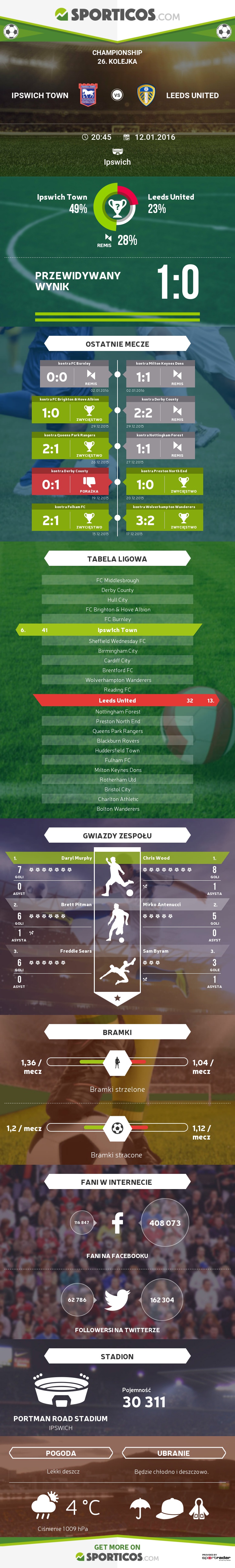 Większość stron zajmujących się angielską piłką twierdzi, że ten mecz zakończy się remisem. Leeds lubi dzielić się punktami, a Ipswich nie jest najlepsze u siebie. Czy tak będzie? Tego dowiemy się we wtorkowy wieczór.
