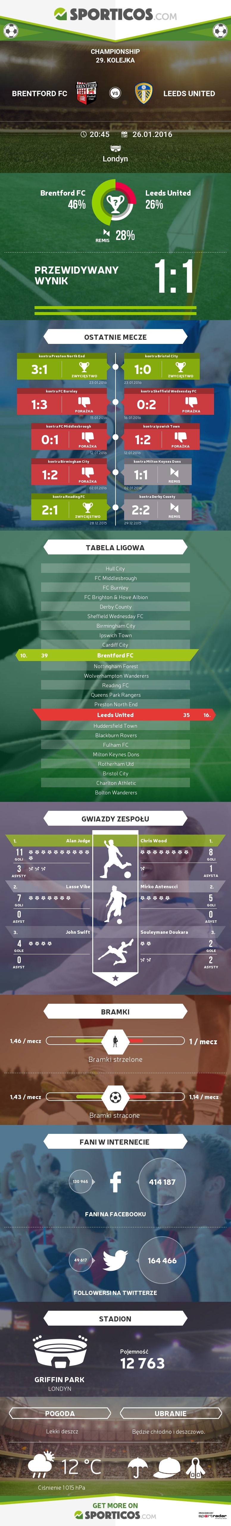 W przypadku Leeds operowanie samymi wynikami to za mało do opisania, że Pawie nie są obecnie w najlepszej formie. Co prawda passa 5 meczów bez zwycięstwa została zakończona w sobotę po zwycięstwie nad Bristol City, jednak styl w jakim Pawie wygrały to spotkanie pozostawia wiele do życzenia. Co więcej Również poprzednie ligowe zwycięstwo z Preston (20 grudnia) również zostało wymęczone przez Leeds. Jeśli chodzi o mecze na wyjeździe to rozbrat ze zwycięstwami poza Elland Road jest dla Leeds praktycznie równie długi co seria Brentford bez zwycięstwa na Griffin Park. Leeds ostatnio wygrało na wyjeździe na Molienaux 17 grudnia, kiedy odprawiło Wili 3:2 po pasjonującym spotkaniu.
