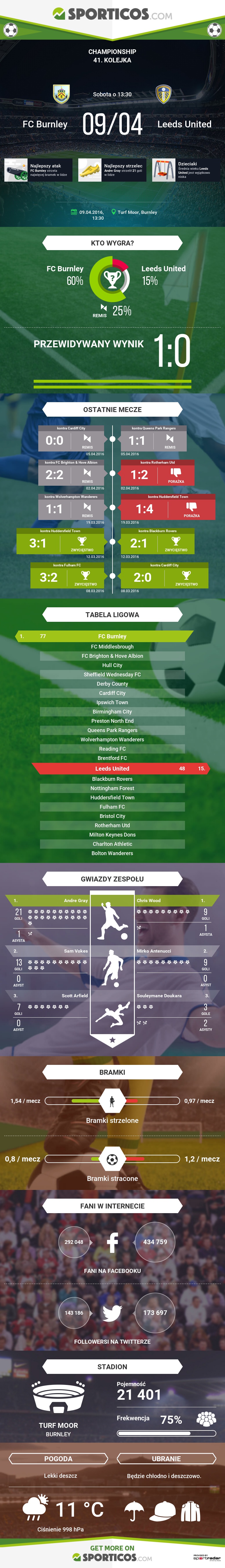 Jeśli Pawie wygrają jutro na Turf Moor każdy kto postawi na taki wynik złotówkę wygra 6,50 zł. Jednak nie ma się co czarować, Leeds tego meczu nie wygra (obym się mylił). Burnley jest strasznie mocne i za swoją postawę na przestrzeni całego sezonu zwyczajnie zasługuje na awans. Aby jednak ten awans wywalczyć potrzebne są punkty, których The Clarets ostatnio zdobywają mniej niż ich najwięksi rywale Boro i Brighton. Leeds z kolei ma już praktycznie pewne utrzymanie w lidze i Evans może nawet trochę poeksperymentować ze składem i chociaż trener Leeds nie chce za bardzo szaleć ustalając skład do czasu aż utrzymanie nie będzie matematycznie pewne, to może w tym meczu zaskoczyć chociaż jednym piłkarzem. W przeciwieństwie do Krzynka nie liczę na występ Botaki, on został skreślony przez Evansa i dopóki Szkot jest trenerem może kopać piłkę w rezerwach. Nie myślę również, że w jutrzejszym meczu zagra od 1 minuty Bamba, który pewnie usiądzie na ławce (Cooper nie zasłużył na zmianę, a Bellusciego Evans zmieniać nie chce). Myślę, żę możemy jutro zobaczyć Leeds z 2 napastnikami, Woodem i Antenuccim, a także z Murphym w pomocy od 1 minuty. Jestem może niepoprawnym optymistą, ale liczę, że jutro będzie po 1!