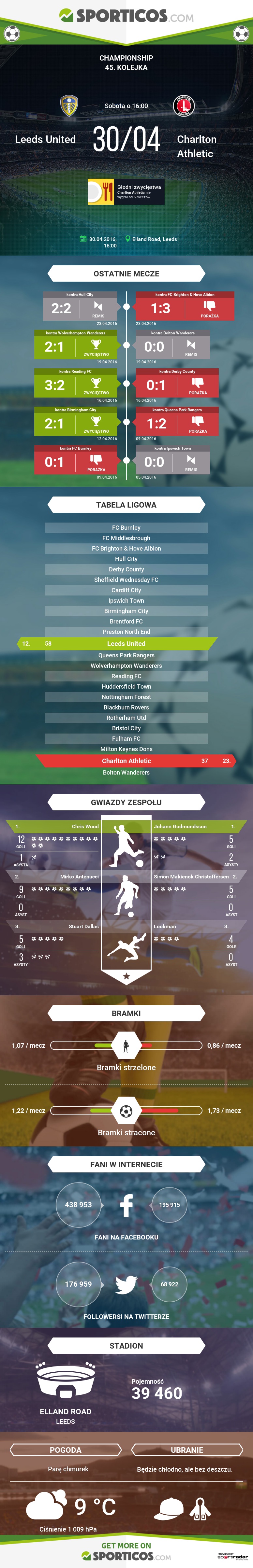 Tak jak Leeds notuje passę bez porażki, tak Charlton notuje serie bez zwycięstwa, która sięga już 5 spotkań. Ostatnie 3 punkty zdobyte przez Londyńczyków to mecz z Birmingham City z 2 kwietnia. Od tamtego spotkania Charlton 2 razy zremisował i 3 razy przegrał w lidze. Jak już zostało wcześniej wspomniane piłkarze Charltonu spadli już z ligi, gdyż strata do 21 Fulham wynosi aż 11 punktów. W przypadku zwycięstwa goście mogą w tabeli prześcignąć MK Dons, ale to dla nich przysłowiowa walka o pietruszkę.