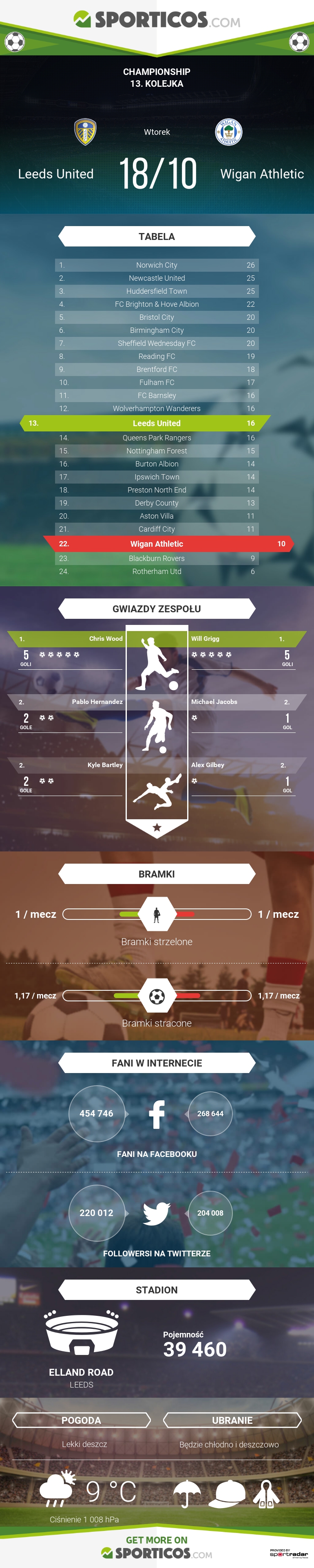 Co ciekawe piłkarze Wigan pomimo tego, że znajdują się na 22 miejscu w tabeli (tracąc do 13 Leeds 6 punktów), to mogą pochwalić się takim samym bilansem bramkowym co Pawie. Dzisiejsi goście notują ostatnio serię 2 bezbramkowych remisów z rzędu (z Burton u siebie i Brentford na wyjeździe) i 3 kolejnych meczów bez porażki (dochodzi do tego domowa wygrana z Preston 2:1 w 10 kolejce Championship).