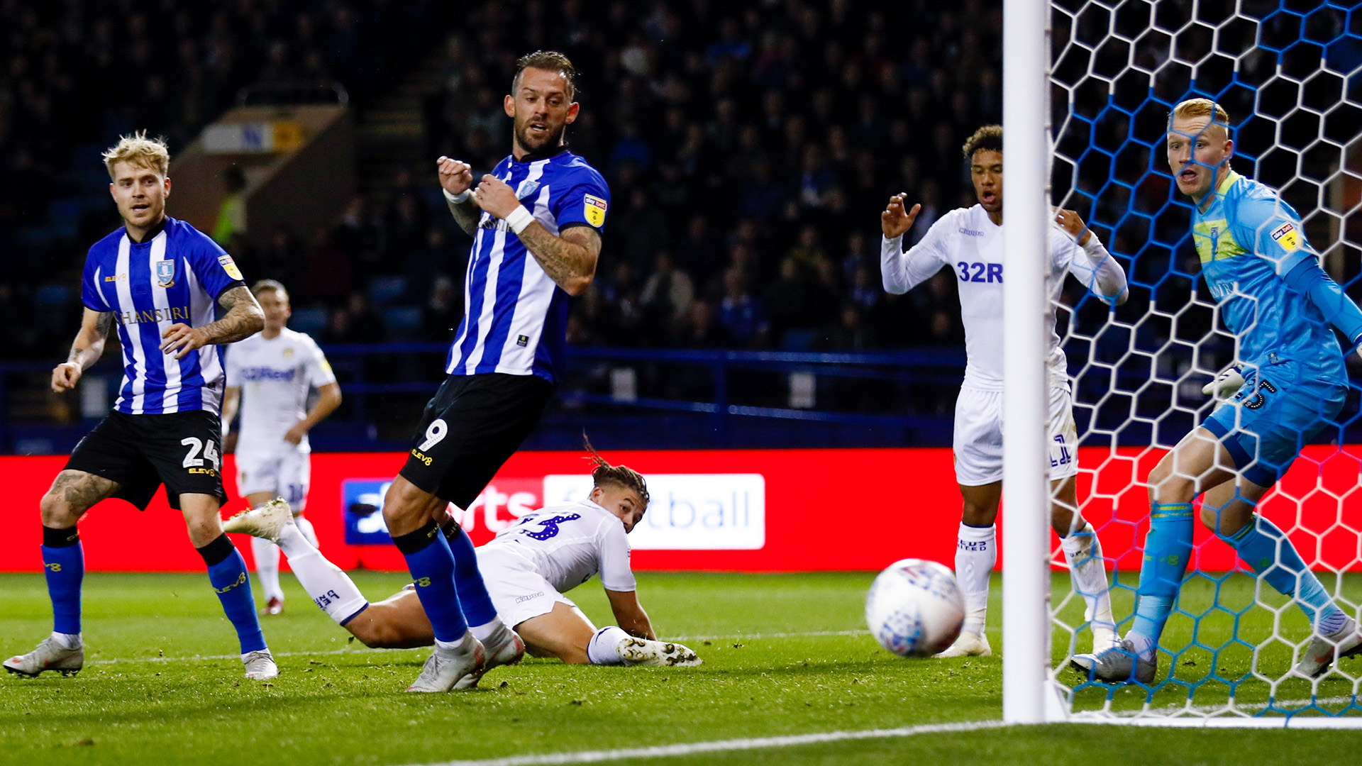 Marcelo Bielsa, zgodnie z zapowiedziami na konferencji prasowej, na to spotkanie wystawił tę samą jedenstakę, co grała tydzien wcześniej z Birmingham. Od początku meczu to podopieczni Bielsy byli stroną dominjącą, która stwarzała dużo więcej okazji. Pierwszą miał Barry Douglas, który doszedł do dośrodkowania Samu Saiza, ale jego uderzenie głową sparował Cameron Dawson. Kilka minut później po rzucie wolnym bitym przez Alioskiego piłki nie sięgnęli Cooper i Roberts, a po kolejnym dośrodkowaniu minimlanie niecleny strzał oddał Jansson. Gospodarze co jakis czas wychodzili z kontrami, a po jednej z nich Steven Fletcher oddał niecleny strzał z woleja. Leeds dalej atakowalo. Bardzo aktywny był Samu Saiz, który w 20 minucie dośrodkowal w pole karne, a wybijający piłke Asiah Baker omal nie pokonał wlłasnego bramkarza. Po rzucie rożnym i ponownym wstrzelniu piłki w pole karne Barry Douglas miał czystą pozycję, ale jego strzał głwoą odbił sie od słupka, a dobitka Philipsa została wybita z linii bramkowej przez obrońcę. Groźne akcje przeprowadziały tez Sowy. Fernando Forrestieri zakręcił Pontusem Janssonem i zagral na prawą stronę do Bakera, który oddal potężny strzał sparowany przez Peacocka-Farrella. Leeds wróciło do ataków, ale gola strzelili gospodarze. Tuz przez przerwą Sheffield miało rzut z autu. Fletcher wygrał pojedynek powietrzny z Douglasem, a do skaczącej piłki doszedł Adam Reach. Pomocnik Sów będąc 30 metrów od bramki Leeds zamknął oczy, oddał strzał, a piłki nabrało niebywałej paraboli lotu, przeleciała nad Peacockiem-Farrellem, opadła za nim, odbiła sie jeszcze od słupka i zatrzepotała w siatce. Bardzo poważny kandydat na bramkę sezonu.