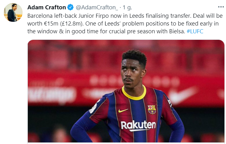 Transfer Juniora Firpo do Leeds United wydaje się już tylko kwestią kilku dni. Adam Crofton z The Athletic podał, że Hiszpan przyleciał już do Anglii, gdzie ma przejść testy medyczne. Wcześniej co do warunków transferu dogadały się już kluby. Leeds na konto Barcelony ma przelać niecałe 13 mln funtów.